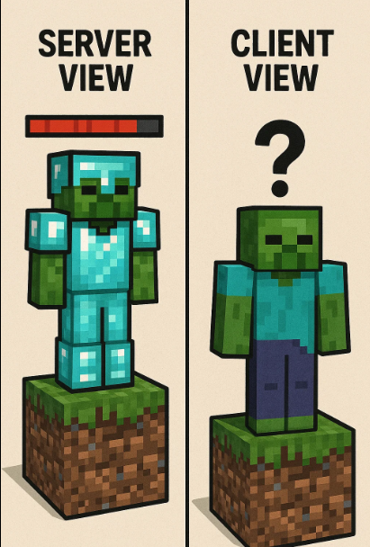 - 정보 단절: 문제는, 서버에서 붙인 NBT 태그 정보가 클라이언트로 자동으로 전달되지 않는다는 점이었음. 클라이언트는 눈앞의 좀비가 평범한 좀비인지, 다이아몬드 좀비인지 전혀 모르는 상태였던 것임.