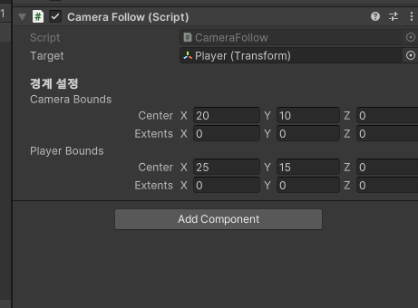 - Main Camera를 선택합니다. 인스펙터 창을 보면 Camera Follow 스크립트의 변수들이 Camera Bounds와 Player Bounds로 바뀌었을 겁니다.