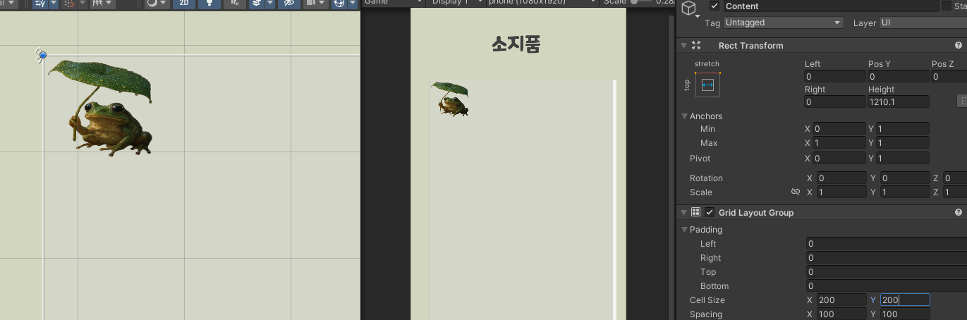 - Grid Layout Group 설정: 새로 추가된 Grid Layout Group의 속성을 다음과 같이 조절합니다.
