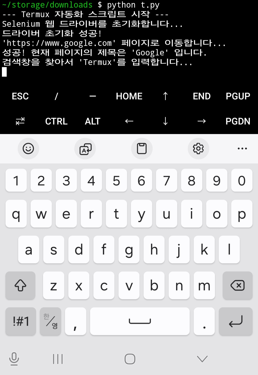 --headless 옵션 때문에 스마트폰 화면에는 아무런 브라우저 창도 뜨지 않을 것입니다. 대신, Termux 화면에 아래와 같이 코드에 적어둔 print 문들이 순서대로 출력될 것입니다.