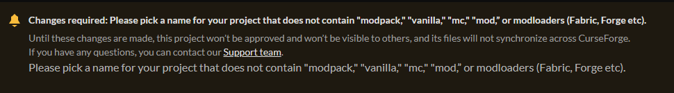 커스포지(CurseForge)에서 프로젝트 승인이 거절된 이유는 '프로젝트 이름(제목)' 때문입니다.