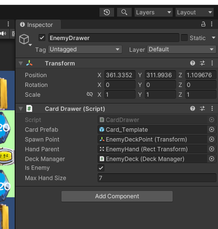 - 드래그는 플레이어만 합니다: CardDraggable 스크립트는 마우스로 끌어서 카드를 내는 로직입니다. 적(AI)은 마우스를 쓰지 않고 코드로 카드를 바로 필드로 이동시킵니다.