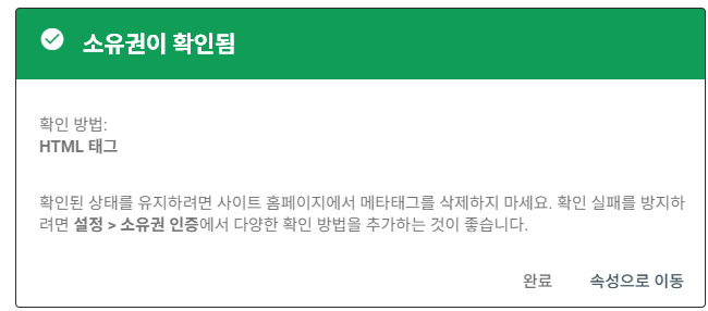 - 다시 네이버 서치어드바이저 화면으로 돌아와서, [소유 확인] 버튼을 클릭합니다. 잠시 후 소유 확인이 완료되었다는 메시지가 뜹니다.