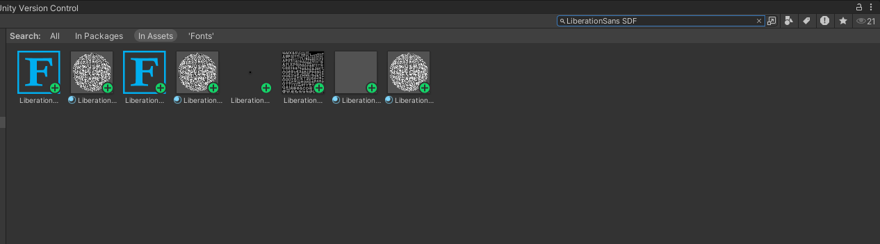 - Project 창 검색 바에서 LiberationSans SDF를 검색하세요. (검색 범위는 All로 설정)