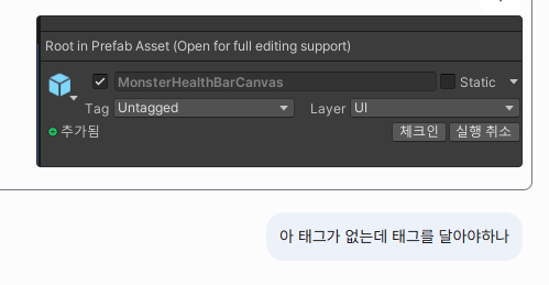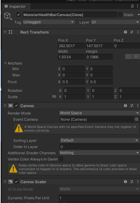 - 생성된 캔버스의 이름을 MonsterHealthBarCanvas로 변경합니다.